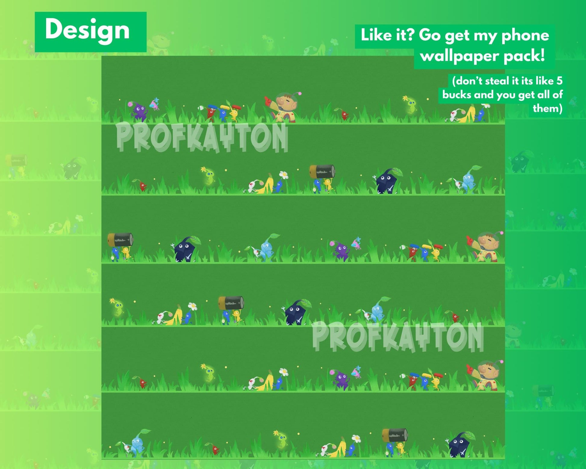Little guys in the grass! Its Pikmin! Enjoy this horizontal stripe inspired design of your favorite pikmin from games 1-4, and Olimar of course!